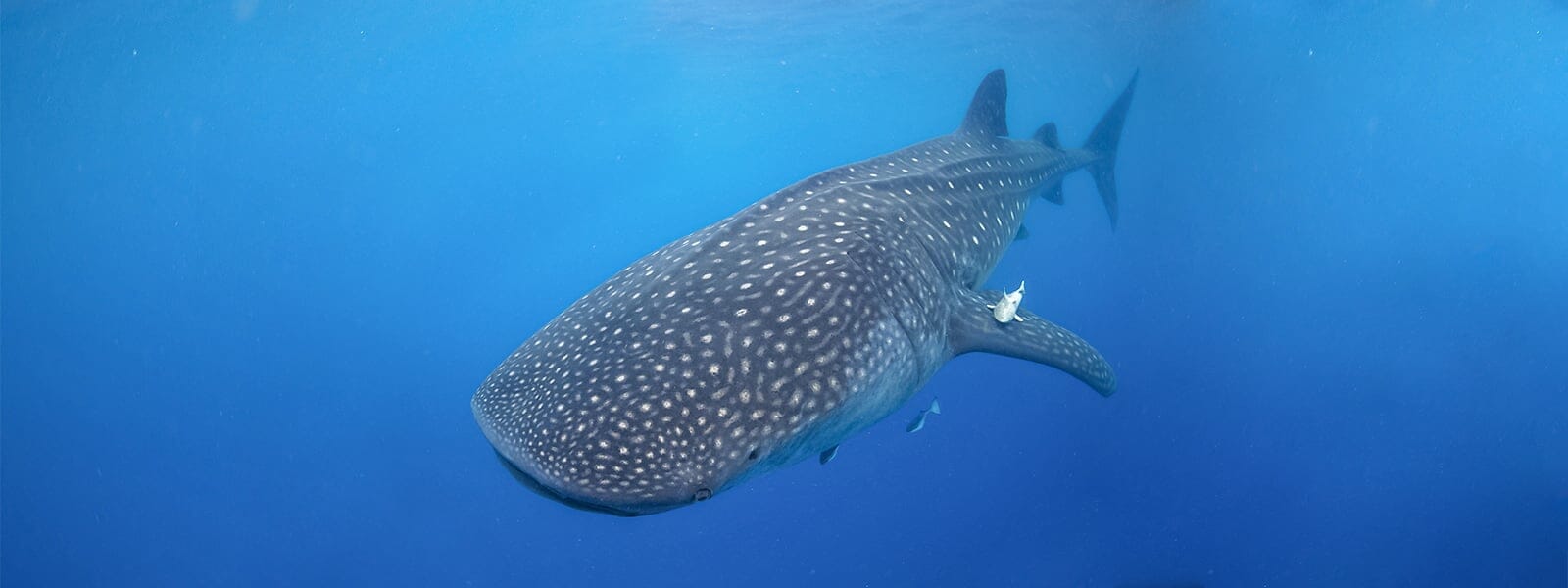 Whale sharks are slow-moving, filter-feeding carpet sharks found in tropical and warm-temperate seas. They are the largest extant fish species and, when full grown, can weigh well over 20,000 pounds and reach lengths easily exceeding 30 feet. Though whale sharks are technically sharks, their behavior and anatomy do not resemble what many people think of (and fear) when they think of “sharks.” Like whales, whale sharks feed on plankton and other very small nektonic life. They are not aggressive and pose virtually no risk to human divers.