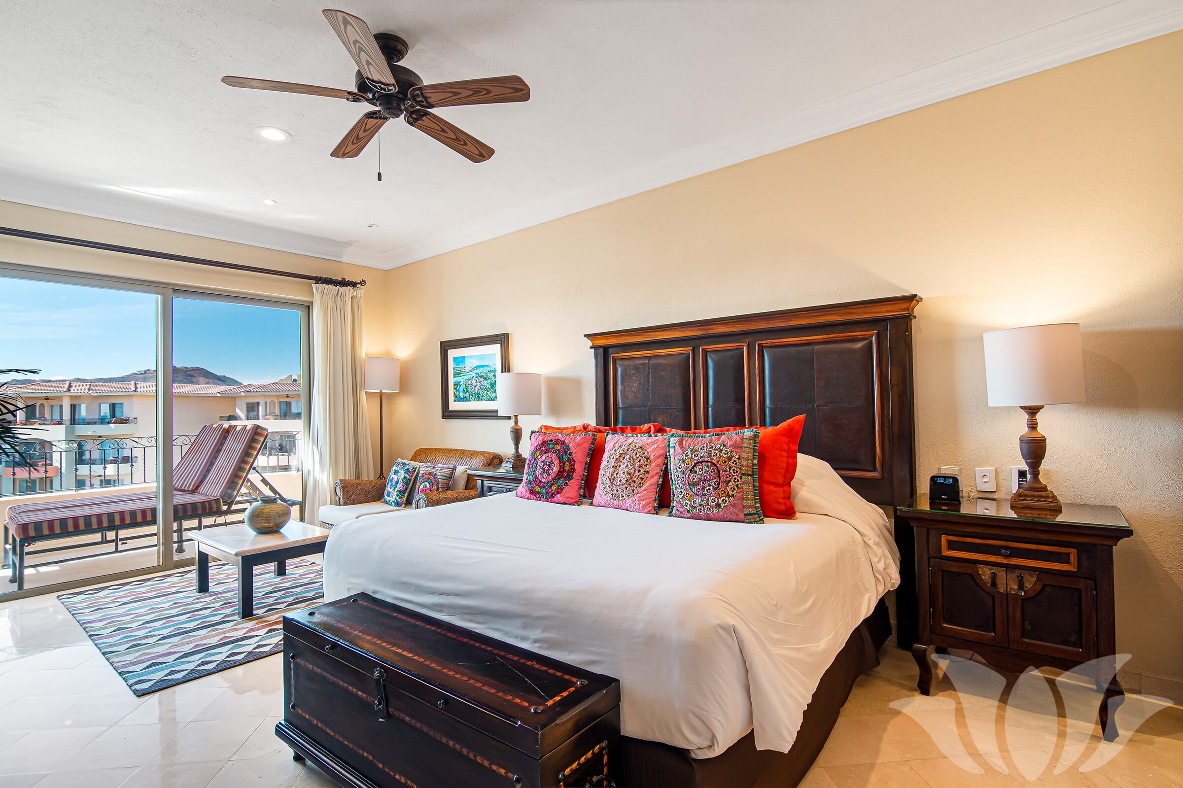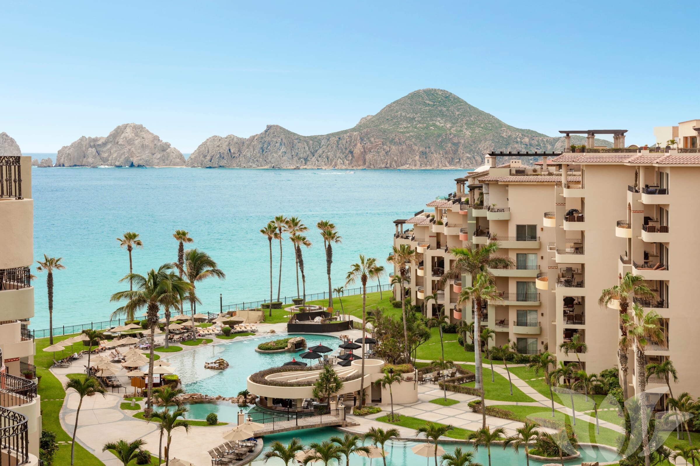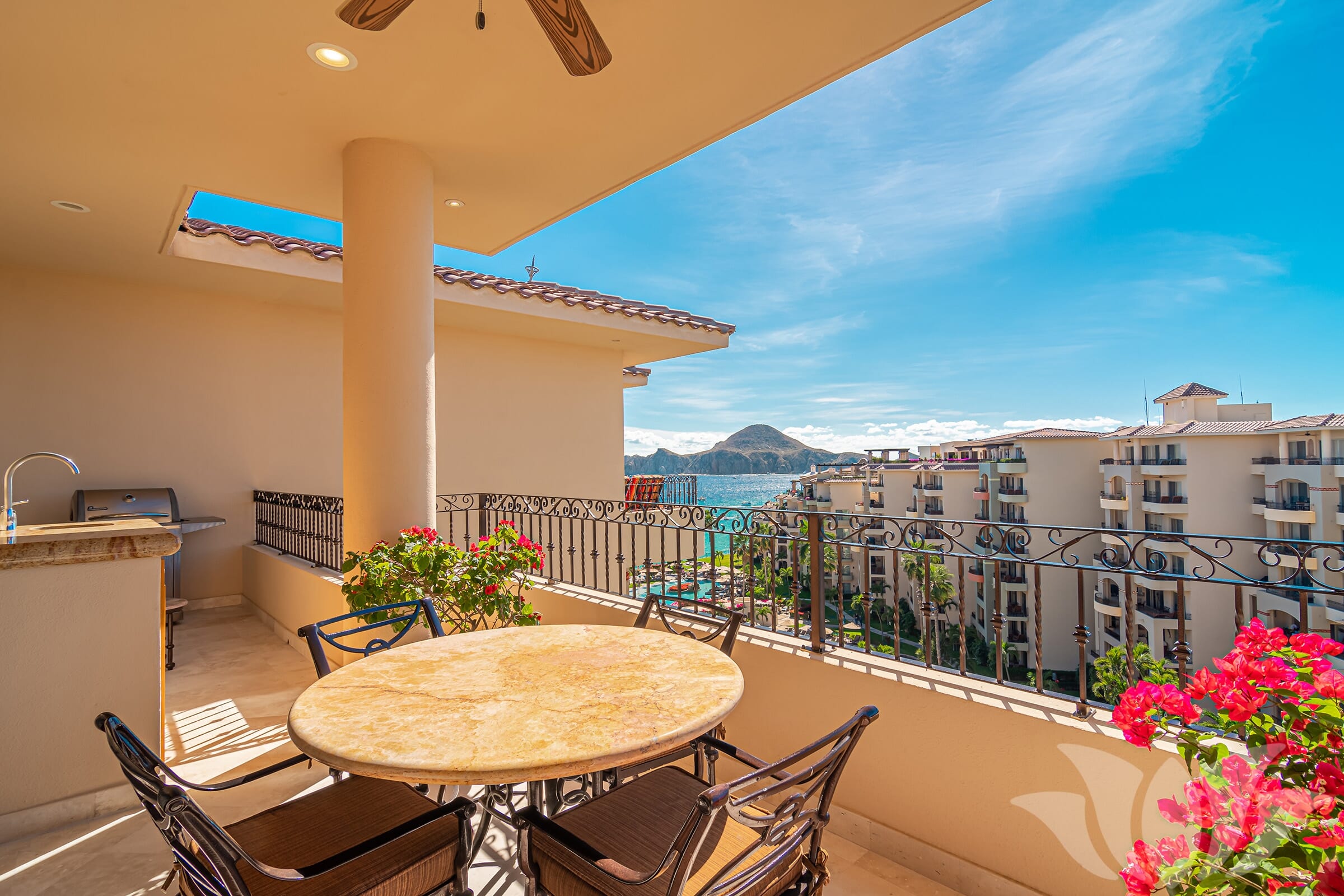This premium ocean view condominium features airy 10-foot ceilings and enviable views of the garden courtyard, sapphire-blue Sea of Cortez beyond and Cabo’s ‘Land’s End’ in the distance.